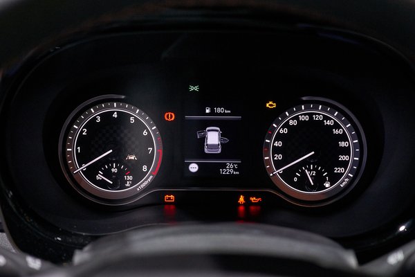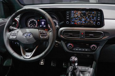 És hoppá, rendes műszerfalat kapunk! A klasszikusan téglalap alakú tető egyik felét négy valódi műszer foglalja el, a másikat pedig egy integrált, nyolc hüvelykes érintőképernyő. Nincs semmilyen tabletes modernkedés, de ez csak a dizájnra érvényes, a rendszer nagyon is mai. Android Auto- és Apple CarPlay-képes, tud drótnélküli töltést, és a Hyundai Bluelink online kapcsolat, sőt az azonnali frissítést kínáló Live Services csomag is elérhető.
