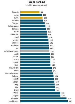 Ebben a műfajban hagyományosan a japánok brillíroznak, de a Hyundai luxusmárkája, a Genesis az idén átvette a vezetést a Lexustól. Nem is kis különbséggel: a koreai márka autói átlagosan 89 hibát produkáltak száz autóra vetítve, míg a Lexus esetében kerek 100-as eredmény jött ki. Az élmezőnyt a Buick (103), a Porsche (104) és a Toyota (113) alkotta a legfrissebb felmérésben. Az iparági átlag egyébként 134 hiba száz autóra, a Land Rover pedig 220-as eredménnyel lett a legutolsó.