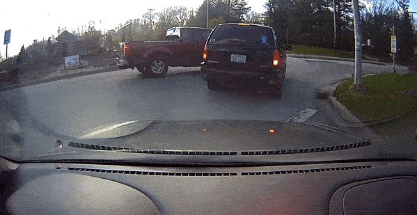 A balesetet egy fedélzeti kamera vette fel, és kiválóan látszik rajta minden. A GMC sofőrje nem túl körültekintően behajt a körforgalomba, majd amikor észreveszi a Nissan Frontiert, rátapos a fékre. Sajnos azonban már túl késő volt, így is összecsúsztak. Ezután a GMC elkezd tolatni, de ez is annyira jól sikerül, hogy a mögötte lévő, fedélzeti kamerás autóba is belemegy - a folyamatos dudaszó ellenére is.