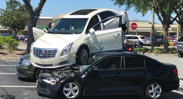 Sajnos a sofőr nem így tett - azt nem tudni miért, valószínűleg összezavarodott és bepánikolt - és kitolatott a főútra, majd még a szembesávba is átkanyarodott, sőt, egy kereszteződésen is áthajtott mire két parkoló autó tetején kikötött Cadillac XTS-ével. Szinte csoda, hogy nem történt nagyobb baleset, bár egyszer nagyon közel járt ahhoz, hogy belemenjen egy pickupba. Az egyik arra járó sofőr fedélzeti kamerája az egészet rögzítette: