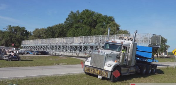 Ahogy az ilyen óriásszerelvényeknél lenni szokott, az út megtervezése kiemelten fontos. Nem mindegy, hogy hol mennek - nem csak az utak, hanem a mellettük lévő táblák, és fák is gondot jelentenek - rengeteg rendőr, és felvezető autó biztosítja az útvonalat, és ahogy a videóban is látszik, folyamatosan rádiókapcsolatban vannak a sofőrrel, és segítenek neki. Ennél az esetnél a floridai autópálya rendőrség még a forgalmat is megállította több helyen, hogy legyen helye a kamionnak. Bár elnézve a videót, máshogy ez nem is működött volna.