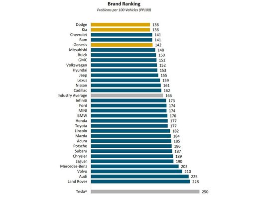A felmérés eredménye sok tekintetben meglepő: a vizsgált autómárkák közül a Dodge, a Kia, a Chevrolet. a Ram és a Genesis alkotta az élmezőnyt, míg az olyan presztízsmárkák, mint a BMW, a Mercedes, a Volvo vagy az Audi, bőven az iparági átlag alatt teljesítettek. Az átlagérték egyébként száz autóra vetítve 166 hiba, a Dodge és a Kia 136 hibával lett holtversenyben első, míg a sereghajtó Land Rover 228 ponttal az utolsó lett – legalábbis azok közül a márkák közül, amelyek hivatalosan részt vehettek az összehasonlításban. A Tesla ugyanis nem járult hozzá, hogy szerepeltessék a felmérésben abban a 15 államban, ahol ez kötelező. Ugyanakkor a maradék 35 államban gyűjtött adatok alapján a felmérés készítői szerint a kaliforniai gyártó autói messze a legproblémásabbak, legalábbis új autóként: 250 hibát számoltak össze 100 autóra vetítve.