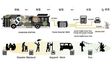 A Moving e elnevezésű rendszert elsősorban természeti katasztrófák esetére tervezték, és három fő elemből áll. A Charging Station nevű üzemanyagcellás autóbuszból, valamint a Honda Power Exporter 9000 jelzésű nagy teljesítményű inverteréből, és a szintén a Honda által gyártott hordozható akkumulátorokból. A busz 18 kW töltőteljesítményt biztosít – ezt 300 V-os egyenfeszültségű áram formájában adja le – amit a Power Exporter alakít 100 vagy 200 V-os váltóárammá, amellyel a hordozható akkumulátorokat is tölthetnek, de közvetlenül is helyettesíthetik vele a háztartási hálózatot.