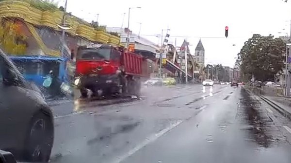 Minden túlzás nélkül – egy robogós újjászületését rögzítette hétfő délben egy autó fedélzeti kamerája a Váci úton. A robogós a Lehel térnél hajtott fel a Váci útra, amikor egy piroson áthajtó teherautó keresztezte az útját. Az esőtől ázott út csak fokozta a drámaiságot, de bármilyen hihetetlen a képek láttán, a robogós csak könnyebben sérült.