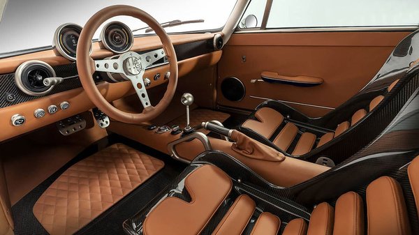 Belül pedig még kevesebb az eredeti Alfa alkatrész, mint a látvány alapján sejthető: az eredeti karosszériából úgy 10%-ot hagynak meg, a nagyobbik részét szénszálas kompozitból újjáépítik – a burkolat így összesen 95 kilót nyom. Nagyrészben ennek köszönhető, hogy az autó, bár 330 kilogrammos akkucsomag kerül bele, csupán 1270 kilogrammot nyom menetkészen.