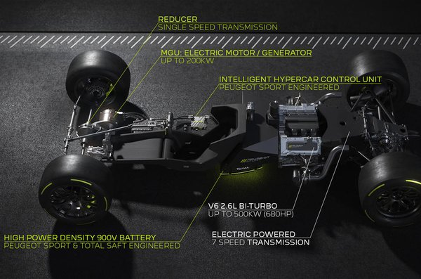 Ez alapján többek közt az is kiderül, hogy egy 2,6 literes V6-os turbós benzinmotort kezdtek fejleszteni a Le Mans-i versenygép számára, ebből jön majd a szabályok által előírt legfeljebb 500 kW, azaz 680 lóerő, amely az autót hajtó teljesítmény nagyobb részét adja majd. Emellett az első tengelyre egy 200 kW-os, azaz 272 lóerős villanymotor dolgozik rá, amelyet egy egyelőre ismeretlen méretű akkumulátorból táplálnak.
