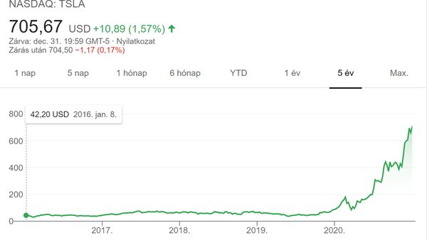 A Tesla részvényei éveken keresztül 50-60 dollár körül mozogtak, de 2020 eleje óta több mint tízszeresére emelkedett az ár (január 2-án 705 dollár), így a Tesla már többet ér, mint az utána következő 9 autógyártó együttvéve. Mellékes hozadéka a dolognak, hogy 2020 novemberére Elon Musk lett a világ második leggazdagabb embere.