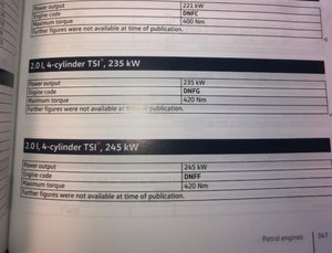 A táblázatban a Golf motorjainak teljesítmény- és nyomaték-adatai szerepelnek, motorkód szerint. A DNFG kódú motor a jelenlegi Golf R-é, ez 235 kW-ot és 420 Nm-t ad le, a DNFF változat pedig azonos csúcsnyomaték mellet 245 kW-ot, azaz 333 lóerőt adhat le. Ilyen változat pedig hivatalosan nem érhető el a Golfban, legalábbis egyelőre.