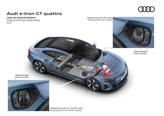 A márka jövőjének szempontjából fontos modellről van szó, hisz az e-tron GT lesz a márka elektromos zászlóshajója, az Audi jelenlegi tudásának mércéje. Technológiai forradalomról nincs szó, az autó nagyságrendileg a konszern-rokon Porsche Taycan szintjét hozza, a piacvezető Tesla Model S-től viszont messze elmarad: a standard e-tron GT hatótávja 488 km, míg az erősebb RS-é 472 km WLTP ciklus szerint. A gyorstöltés némileg kompenzál, a 270 kW-os, 800 V-os töltéssel 23 perc alatt lehet 5 százalékról 80 százalékra tölteni a (nettó) 85 kWh kapacitású, aktív hűtéssel rendelkező akkumulátort, ami 5 perc alatt 100 km-t jelent. Normál, 11 kW-os árammal 9 és fél óra alatt lehet feltölteni az autót.