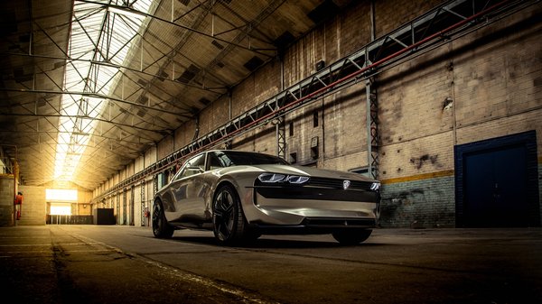 Mástrészt bevillant, hogy ezt a vadiúj logót már láttam két éve, a Párizsi Autószalonon. Az önvezető és teljesen elektromos, de ezzel együtt szívdöglesztően szép E-Legend tanulmányon. Ez az a kétajtós kupé, ami a Pininfarina tervezésű 504 Coupét idézi.
