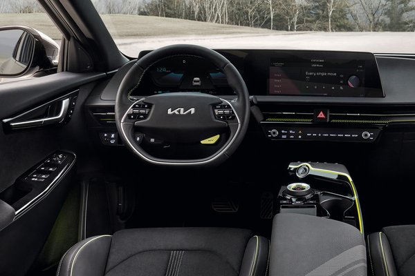 Belül is űrhajós az EV6 kialakítása. Az összképet meghatározza a két darab, egyenként 31 centis átlójú kijelző. Az egyik a műszeregység szerepét tölti be, míg a másik a központi érintőképernyő. A kezelésben is újdonságot vezet be az EV6-ossal a Kia. A központi érintőképernyő alatt egy csíkszerű, keskeny érintőképernyőt helyeztek el, a két végén egy-egy tekerőgombbal. Választhatóan a klíma, vagy az akár 14 hangszórós Meridian hifirendszer kezelőfelülete jelentethető meg, és éppen azt állíthatjuk, amelyiket kívánjuk. Jó ötlet, hogy a klíma egyes gombjai mindig ott maradnak a felületen.