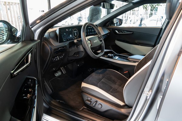 Élőben pont jónak tűnik az EV6 magassága, a tágasra nyíló ajtókon könnyű a beszállás előre és hátra is, mert az ülések magassága kellemes. Meglepetésként ért azonban, hogy viszonylag kemény szivacsokat csomagoltak a GT-Line finom kárpitjába, így az érzés sprőd, sportos – már álló helyzetben vagányságot, elszántságot sugall. Úgy tűnik, így akarja magát megkülönböztetni a Kia a Hyundaitól.