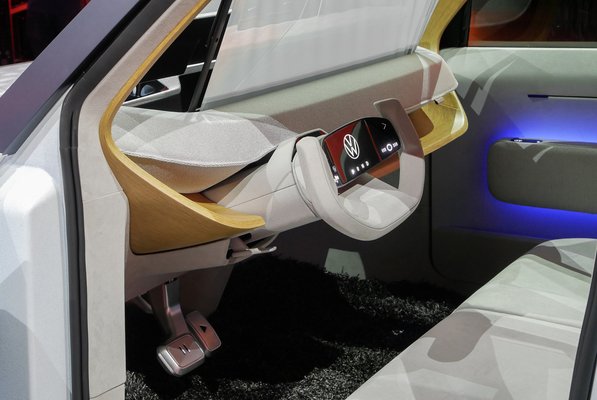 Az ID.Life utastere nem tűnik kicsinek, de hatalmasnak sem, nagyjából egy mai átlag kisautó lábterét kínálja hátul. Persze az utasterét valami retróbútor-őrült tervezhette, hajlított fa polc és sok textilborítás van benne, de azért van egy fogadásom arra, hogy ugyanezt majd jó fekete műanyagból gyártják le. Külön műszeregység nincs, a digitális kijelzőt a kormány közepébe építették.