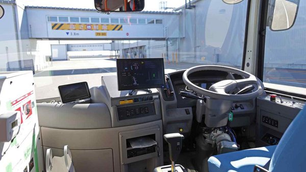 Önvezető busz egy Aichi megyei reptéren. Kép: Nikkei