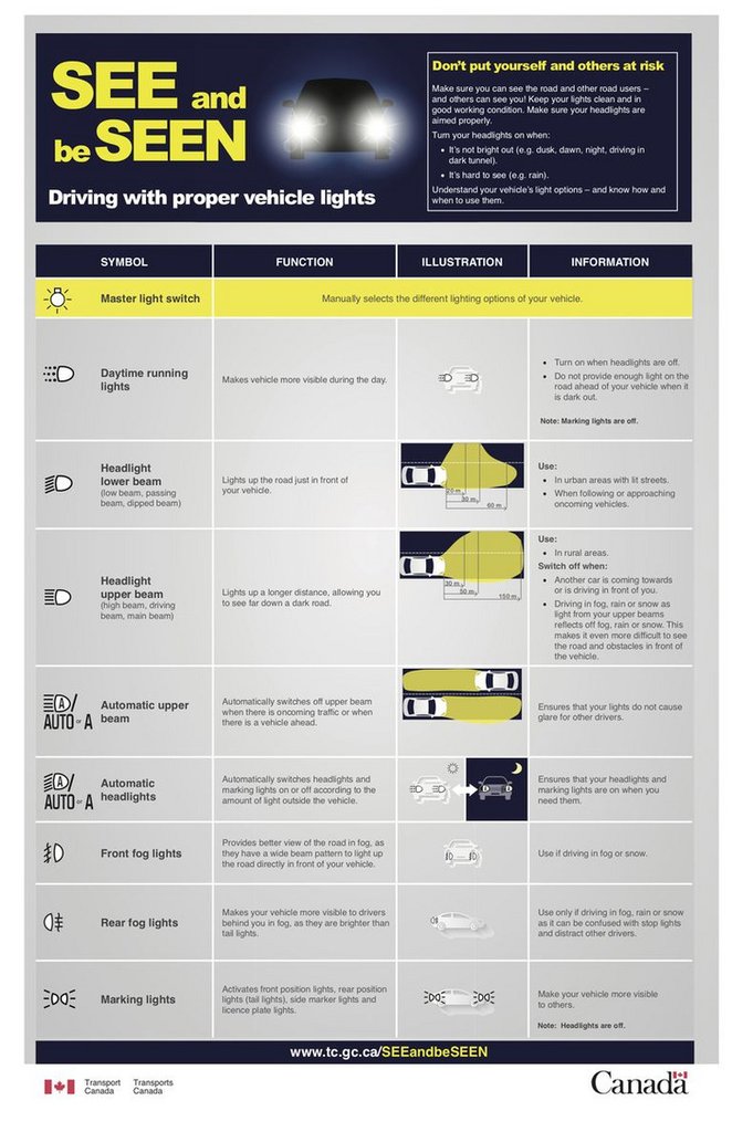Azoknak pedig, akik nem új autóval járnak, egy részletes táblázatot készítettek a kanadai hatóságok, szemléletesen elmagyarázva, mikor mit kellene felkapcsolni, hogy szabályosan és biztonságosan közlekedhessenek.