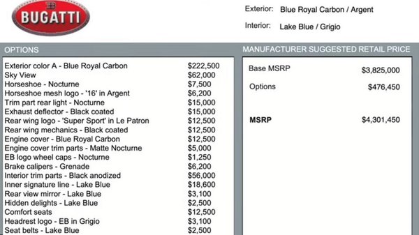 Eloxált fekete beltéri elemeket 56 000 dollárért adja a Bugatti, 12 500 dollár a kékre színezett karbon motorburkolat, ugyanennyibe kerülnek a komfort ülések és a Super Sport logó a hátsó szárnyra, a legolcsóbb tétel pedig az EB felnikupak 1 250-ért. A Chiron kék karbon karosszériájára önmagában 222 500 dollárt locsoltak el az alapárán felül, ez önmagában egy csodás Ferrari Roma ára. Az extrák összesen pedig közel 480 ezer dollárba kerültek.