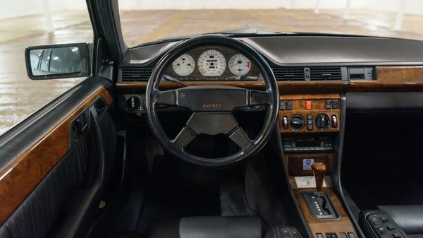 Utasterében fekete bőrkárpit és nagy mennyiségű, fényesre lakkozott fabetét, az átalakítást igazoló plakettel és AMG logókkal. A négyküllős AMG sportkormány mögött 300-ig skálázott műszeregység van, fehér számlapokkal. Határozottan formázott első Recaro sportüléseinek vezérlőpanelje a combot támasztó részen található. Nagyon súlyosan árad belőle az AMG egyik legszebb korszakának retró hangulata.