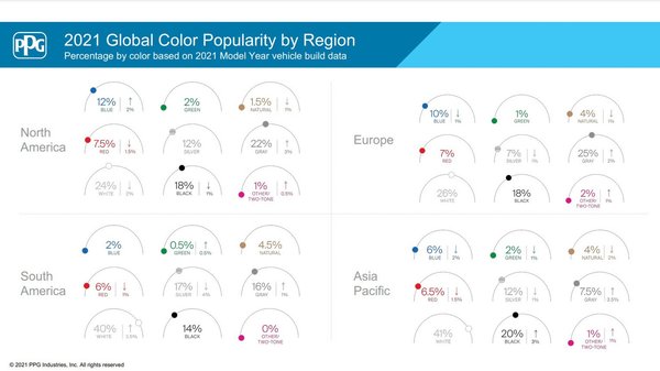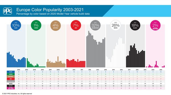 ... a fehér. A PPG az idén is közzétette a statisztikát arról, hogy milyen színekben rendelik az autókat. Az idén is az derült ki, hogy a fekete, szürke és fehér uralkodik, a vásárlók jelentős része látszólag nem igényli a színeket.