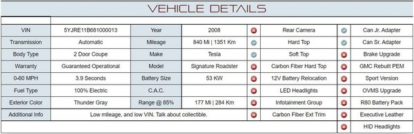 Az eredeti Roadsterből mára körülbelül 2000 darab maradhatott, a használt példányok ára pedig láthatóan megugrott: eddig körülbelül 60 ezer dollárért már hozzá lehetett jutni egy átlagos állapotú darabhoz, mára viszont minimum 100 ezer dollár környékén érdemes keresgélni. Pár hete egy független, Teslákra szakosodott kereskedő/szerviz, a Gruber Motors hirdetett meg egy 2008-as, VIN013-as, tehát egy igen korai Roadstert, amibe ráadásul alig 840 mérföldet tett a tulajdonos 14 év alatt.