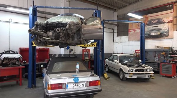 Maga a videó több mint egy órás, de úgyis hétvége van, megéri rászánni az időt. Már a nyitó képsorok is erősek: a repülő- és autóút után a nagy műhelycsarnokba benyitva az egyik sarokban egy géptető nélküli E30, mellette a csáposon egy másik kocsi, alaposan szétbontva. Mintha csak ebédszünetre mentek volna a szerelők.