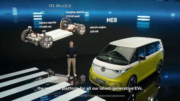 Az autó padlólemezébe egy 77 kWh-s használható kapacitású akkumulátor-csomag kerül, ami egy 150 kW-os (201 lóerős) villanymotort táplál, ez az ősökhöz hasonlóan a hátsó kerekeket hajtja. Az autó váltóáram esetén 11 kW-os teljesítménnyel tölt, míg egyenáramnál 170 kW-os maximumot ír a Volkswagen, ez fél órás töltést jelent 5 százalékról 80-ra. Az ID.Buzz újdonsága a Plug&Charge, vagyis kompatibilis töltők esetén nem kell majd külön app/kártya/token, az autó szoftvere elintézi az autentikációt, és már indulhat is a töltés. Szintén ide kapcsolódik, hogy kétirányú töltés is lehetséges, így az otthoni elektromos hálózat részeként is funkcionálhat az autó.