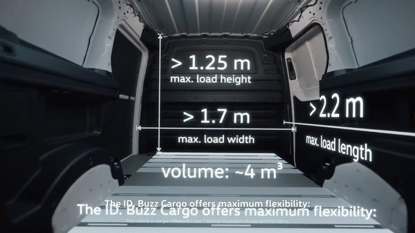 A normál ID.Buzzba 5 ember és 1121 liternyi csomag fér, az üléseket lehajtva ez 2205 literre nő - harmadik üléssorról nem ejtettek szót - ; míg a Cargo verzió csomagtere 3,9 köbméter, 2 szabvány raklap befogadására alkalmas. A 600 kilogrammos belső terhelhetőséghez 100 kilogram plusz pakolható a tetőre. A Cargo a vásárlói igények szerint több konfigurációban is elérhető lesz: a hátsó ajtó lehet dupla kettényíló, vagy egyetlen felfelé nyíló; oldalajtóból is lehet egy vagy kettő; az első üléseket is lehet kérni 1+1-es vagy 1+2-es felállásban. Opcionálisan az utasülés alatt 45 centiméter plusz hely is kérhető, amivel összesen 2,65 méter hosszú teher is befér a csomagtérbe.