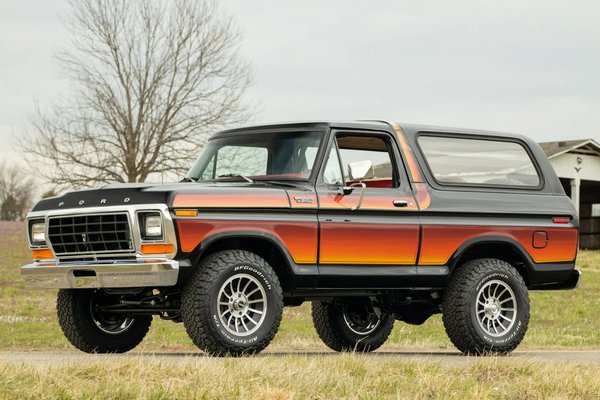 Maradéktalanul hozza a korszak hangulatát a narancssárga színátmenetes dekorral feldobott fekete fényezésű Bronco, mely látszólag tökéletes állapotban van. Szép kiállású autó, aminek szépen csillog lökhárítóján a króm és látványosan magasodik a 17 colos felnikre szerelt BFGoodrich All-Terrain T/A K02 gumik fölé.