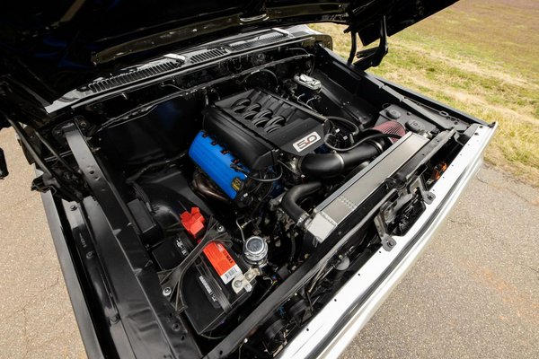 Piros bőrrel kárpitozták az első és hátsó padot is, így a beltere is nagyot mutat a Bronconak, szinte látom, hogy a cowboy kalapos fazon terpeszkedik a kormány mögött. A Firehouse Vintage Vehicles viszont nem csak restaurálta az 1979-es évjáratú Ford Broncot, hanem fejlesztette is. Gépházteteje alatt a Ford Mustangból is ismerős 5,0 literes, szívó V8-as található, vagyis a Coyote (prérifarkas) névre keresztelt blokk. Hozzá a Ford 6R80-as 6 sebességes automata váltó kapcsolódik és összkerékhajtás.