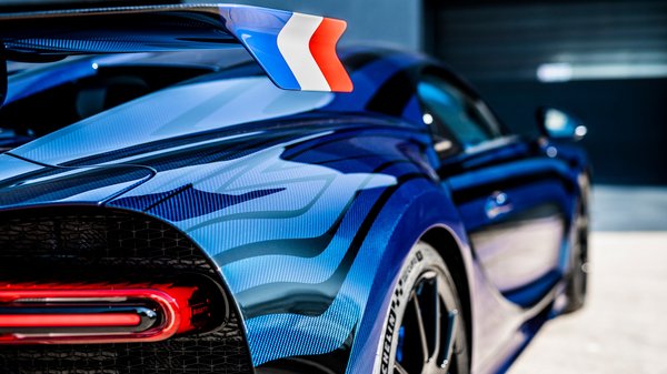 Ezek mind elég kontrasztos művek lettek, azonnal érzékelhető látványosság. A Pur Sporton azonban a sötétkék karbon karosszériára szinte fekete árnyalattal festették a reflexiókat, így messziről egy sima sötétkék Chironnak néz ki az autó, közelről viszont bámulatos a vonalak áramlása, de szép részlet a francia trikolór megjelenése is a szárnyak végén.