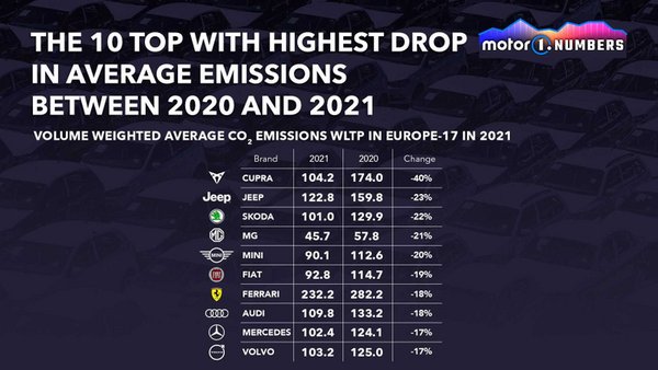 Az egy év alatt elért javulások figyelemre méltóak: a Cupra 40 százalékkal csökkentette a széndioxid-kibocsátását, második helyen a Jeep, harmadik helyen pedig a Skoda áll 23, illetve 22 százalék mínusszal. Az eladásokból az is látszik, hogy nem kizárólag a teljesen elektromos modellek segítettek a jó eredményekben, legalább olyan fontosak a nagyobb mennyiségben értékesített plug-inek.