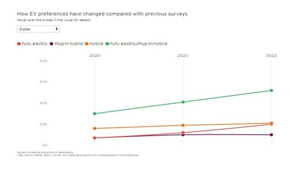 Az EY Mobility Consumer Index felmérése szerint globális szinten már az újautó vásárlók több mint fele vásárolna tisztán elektromos hajtású autót, ez két év alatt 22 százalékos növekedést jelent.