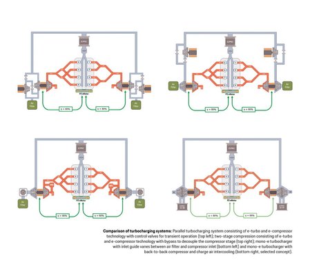 A legkomolyabb kihívást a turbók jelentették: "A hidrogén tiszta égéséhez kétszer annyi levegőre van szükség, mint a benzinmotorok esetében, miközben a kipufogógáz alacsonyabb hőmérséklete miatt nincs elég energia a turbók meghajtásához." A fentiek miatt elektromos kompresszort használtak a tesztmotorhoz, ami a szimulációk szerint 590 lóerőt teljesít – ez több, mint a mostani Porsche Cayenne Turbo S E-Hybrid 4 literes V8-asának 541 lóereje.
