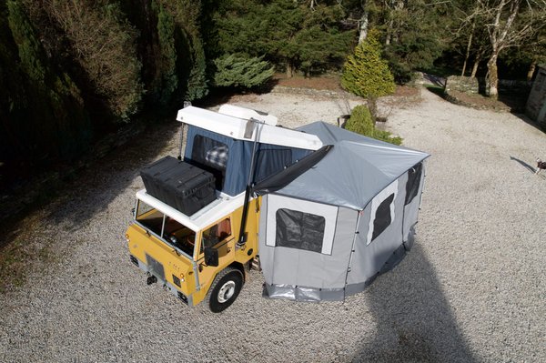 Például a teljes raktér tele van tárolókkal, fakkokkal és ládákkal. Nagyon hangulatos, hogy a padló és a tárolók borítása fából készült, ami nagyon jól mutat a külső – és sok helyen a belső – sárga színével. Ahelyett, hogy a rakteret használták volna, inkább bővítéssel oldották meg a hálószobát: a tető nyitható, így egy belülről is elérhető tetősátorban lehet aludni. A sátor külső részét – ami egyben az autó teteje – egy hatalmas teleszkóp emeli meg. A tetőre még klíma és napelem is jutott, ezek súlya miatt pedig teljesen érthető a teleszkóp is.