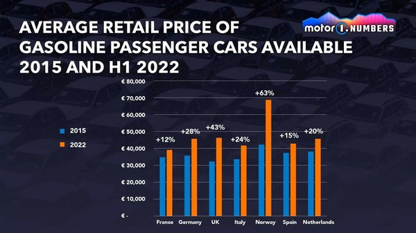 Ehhez képest számos európai országban jelentősebb mértékű áremelkedés volt megfigyelhető a vizsgált időszakban: Németországban, Olaszországban, Franciaországban, az Egyesült Királyságban, Spanyolországban, Hollandiában és Norvégiában egy új autó átlagos ára 35 500 euró (14 millió forint) volt 2015-ben. Ehhez képest idén júniusra egy új autó átlagos ára 44 101 euróra (17 millió forint) emelkedett.