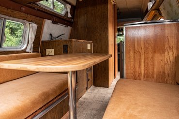 Szerencsére a Dodge belterét nem modernizálták feltűnően: mindent a fa és a farostlemezekre felnyalt, fahatású fólia ural, felütve némi plüssel. Bár a furgon hatalmasnak tűnik, a lakótér mégsem igazán tágas. Elöl van egy minimálisan felszerelt konyha, egy elképesztően kicsi zuhanyzó, hátul pedig egy ebédlő, ami egy asztalból és két padból áll. Aludni az autó hátsó részében, az asztalos rész fölött kialakított részen lehet. Pozitívum, hogy a kora ellenére még légkondi is van benne.