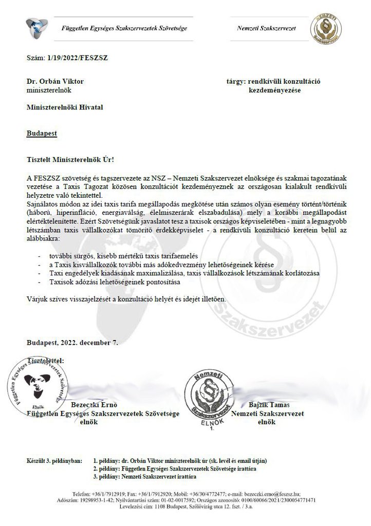 Alig fél évvel ezelőtt emelkedtek a taxis tarifák: az alapdíj 700 forint helyett 1000 forint, a kilométerdíj 300 helyett 400 forint, a percdíj 75 helyett 100 forint lett. A benzinárstop tegnap esti eltörlése azonban új megvilágításba helyezte az eddigi árszabást, a Független Egységes Szakszervezetek Szövetségének Taxis Tagozata egy Facebookon közzétett levél szerint Orbán Viktorral indítana konzultációt az ügyben. A kommentek között közepesen fenyegető kontextusban már a tömegközlekedés megállítását is kilátásba helyezte az oldalt jegyző "NSZ - Taxis Tagozat".