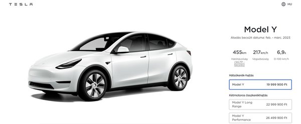 A Model 3 ára bekúszott 19 millió forint alá, így nagyjából 3 millió forinttal lett olcsóbb. Ami viszont talán még ennél is meglepőbb, hogy a jóval tágasabb Model Y árát is levitték 20 millió forint alá, így a két modell közti különbség már csak 1 millió forint, amivel a több gyermekkel rendelkező Tesla fanoknak is kedveskedtek - nem titkolt céljuk ezzel a lépéssel, a vásárlási kedv élénkítése.