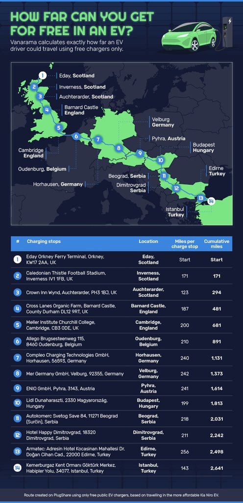 A képzeletbeli túra teljes távja 4250 kilométer, amit az elméleti tanulmány 12 ingyenes töltőpont érintésével tálal. Az elméleti kísérlet számol azzal, hogy az elektromos autók hatótávja jelentősen változhat az időjárási körülmények, a vezetési stílus vagy az utasok és csomagjaik számától függően. Így felhívják a figyelmet, a Niro EV-nél akadnak nagyobb hatótávolságú autók is, és vannak fizetős töltőpontok is.