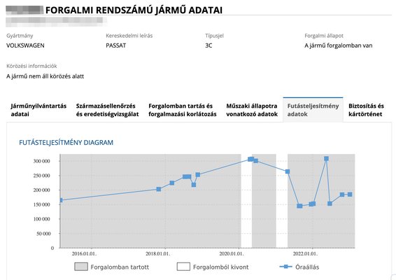 A futásteljesítményről szó sem esik, az adatok között kicsivel több mint 170 ezer kilométer szerepel, de az eddigi 17 tulajdonos ennek többszörösét hajthatta a Passatba: a görbe előbb 2020-ban, 307 ezernél tetőzik, majd rendesen visszaesve erőt gyűjt, hogy egy magányos csúccsal 309 ezerig törjön a korábbi 144-ről.