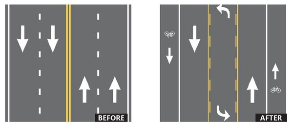 Ennél valamivel bonyolultabb, de még mindig olcsó megoldás az utak „fogyókúrára fogása” (road diet). Ez azt jelenti, hogy a négysávos utakat három sávossá alakítják. Két oldalt megmarad az egyenesen haladó sáv, miközben középen kialakítanak egy sávot a mindkét irányból érkező balra kanyarodóknak.