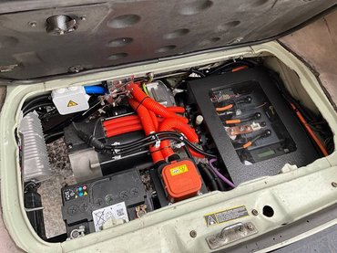 Mint látható, ebbe még az autóhoz illő komolyságú hangrendszer is került, a praktikus tetőcsomagtartó és a korhű légterelők kiegészítéseként. Az akkumulátorok kapacitásáról, a motor teljesítményéről és az inverter típusáról nincs információ, mert az aukciós oldal az ötezer eurós ambíciói mellett csak annyit osztott meg a járműről, hogy német papírjai vannak. Az viszont az alacsonyfelbontású fotókból is kiderül, hogy ez nem holmi barkácsmunka.