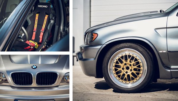 Az egyedi X5-öst 30 milliméterrel leültették, illetve más rugókat és szilenteket kapott, mint egy utcai változat. A kerékjáratokat 20 colos, aranyszínű BBS LM felnik töltötték meg, amikre elöl 275/40-es vagy 315/35-ös, hátra pedig minden esetben 315/35-ös Michelin gumikat szereltek. A külső egyébként nagyban emlékeztet a gyári X5-ösökére, de azért a géptető hatalmas légbeömlője, a hatalmas toldatok, illetve a hátsó lökhárítón kivezetett kipufogó gyanúsnak tűnik első ránézésre is, ahogy a kerekek sem épp visszafogottak.