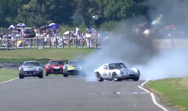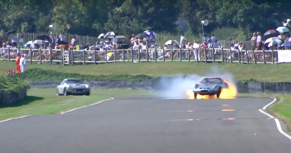 Ilyenkor azonban előfordul, hogy egy 1962 és 1964 között gyártott, tehát már nagyjából 60 éves autó elfárad, és hisztizik kicsit. Most is ez történt a Goodwood Revival egyik versenyén: az egyik kanyar után enyhén keresztben érkezett egy ezüst 250 GTO, majd a motorteréből óriási lángok csaptak fel. A lángok szinte azonnal kialudtak, de az autó útja a fűre vezetett.