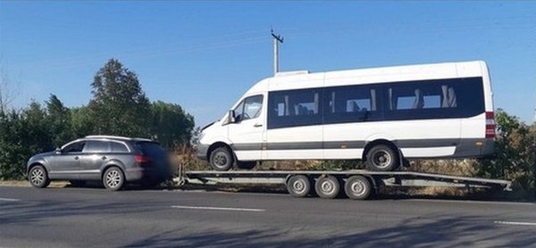 Az Audi mögé akasztott, hosszú trélerre nem akármilyen Mercit dobtak fel: egy bő 7 méter hosszú, hátul duplakerekes személyszállító Sprintert vitt az Audi. Talán nem meglepő, hogy ez a szerelvény is túlsúlyos volt.