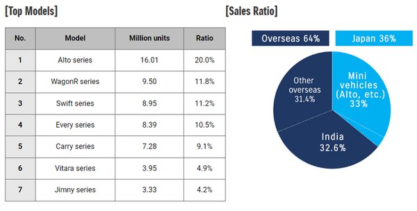 A Suzuki 1989 júniusában lépte át a 10 millió eladott autót, az 50 milliót 2013 áprilisában és a 70 milliót 2020 januárjában.