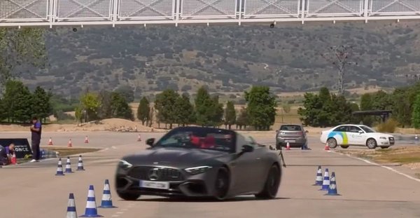 Most a mérges és erős, Mercedes-AMG SL 63-at vetették alá a tesztnek: a nagy és nehéz roadster azonban nem volt annyira agilis, mint amit a külseje ígér. A 77 km/h-s teszten a sofőr nem ismerte az autó reakcióit - direkt így tesztelnek első körben -, és fel is döntött pár bóját.