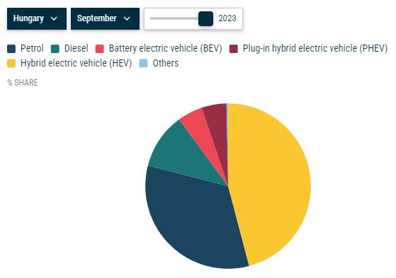 Ezen belül 22,2 százalékkal több (4199) villanyautót, 19,3 százalékkal több (4261) plug-in hibridet, 6,7 százalékkal több (33 302) hibridet, 14,2 százalékkal kevesebb  (30 675) benzinest és 8,9 százalékkal kevesebb (10 108) dízelt helyeztek forgalomba az idei év szeptemberéig.