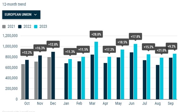 Uniós viszonylatban viszont jobb a helyzet. Az idei első kilenc hónapban 7 millió 941 ezer új személygépkocsit helyeztek forgalomba, ami 16,9 százalékos növekedés a tavalyi azonos időszakkal összevetve. A négy legnagyobb uniós autópiac közül Olaszországban volt a legjelentősebb a növekedés, 20,5 százalékos az első kilenc hónapban, majd Spanyolország következett 18,5 százalékkal, Franciaország 15,9 százalékkal és Németország 14,5 százalékkal.
