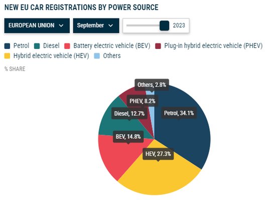 Szeptemberben villanyautókból 127 149-et helyeztek forgalomba, 14,3 százalékkal többet a tavaly szeptemberinél, ezzel a piaci részarányuk 14,8 százalék. A forgalomba helyezett hibrid autók száma 30,5 százalékkal, 235 348-ra bővült éves összevetésben, a piaci részarányuk 27,3 százalék volt. A plug-in hibrid autók eladása pedig 0,4 százalékkal, 70 578-ra nőtt, piaci részesedésük 8,2 százalék volt.