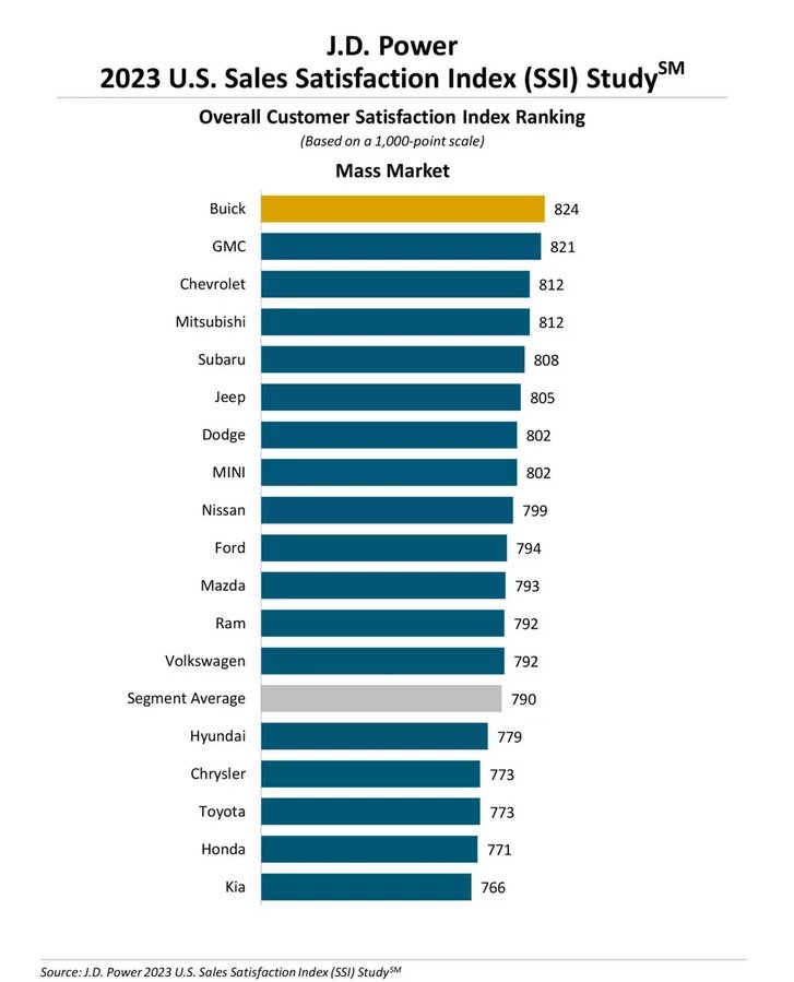 A vásárlók elégedettségét több kategóriában, márkánként is mérték. A tömegautók között a Buick végzett az élen, míg a Toyota és a koreaiak gyenge szereplése mindenképpen meglepő.